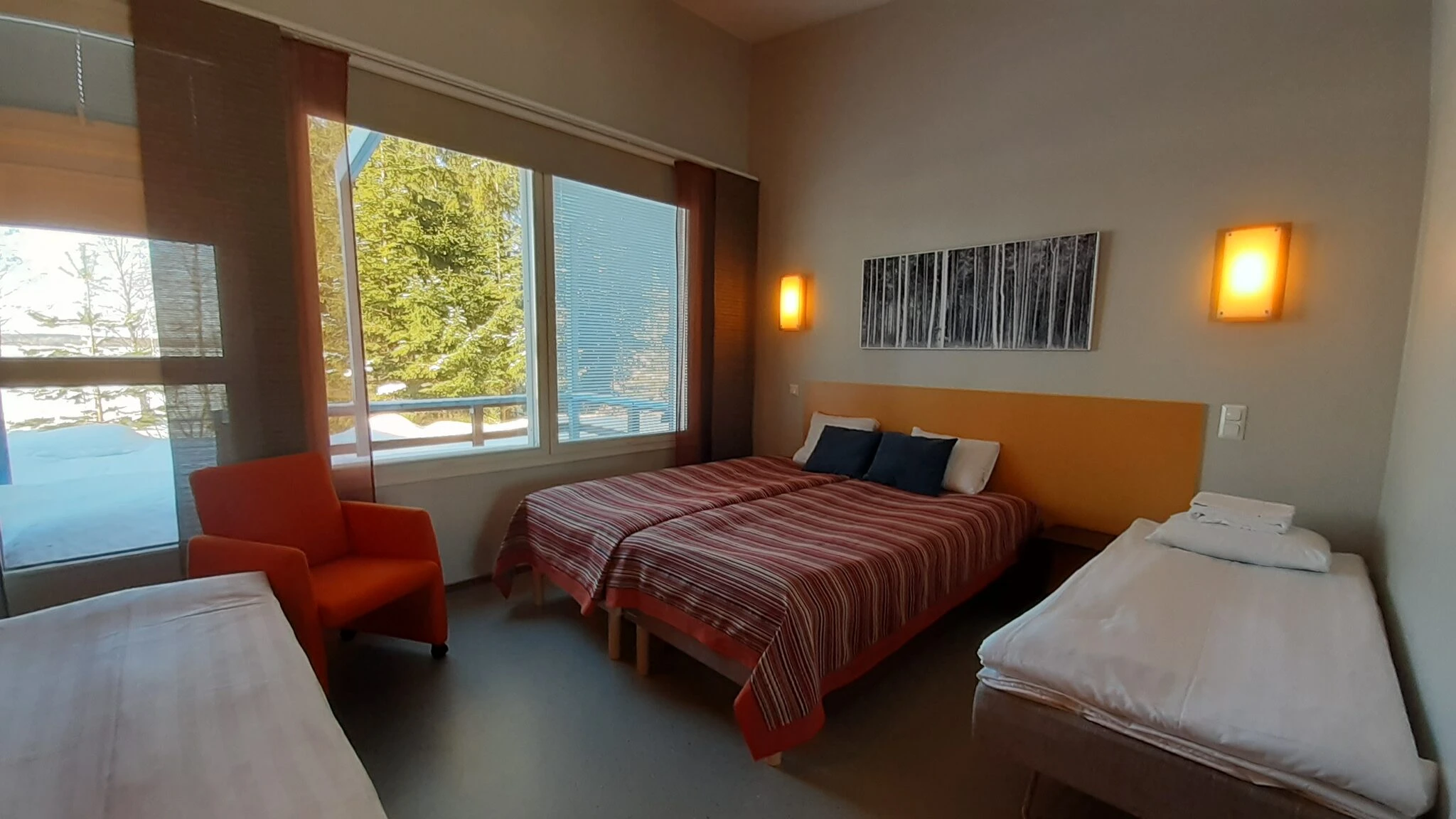 Huone on kooltaan n. 20 m2 ja siinä on oma kylpyhuone, tv, jääkaappi, wifi sekä terassi järvinäköalalla. Huoneessa on 2kpl Unikulman hotellivuoteita 90x210cm sekä 2 kpl varavuoteita 80x190cm. Vuoteet on valmiiksi pedattu.